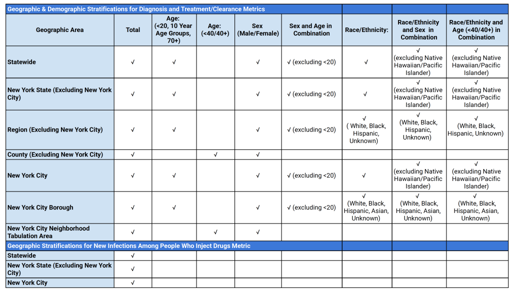 Data for new HCV infections aged 18-40 is available at the statewide, rest of state (NYS excluding NYC), and NYC citywide levels, with no demographic stratifications currently available.